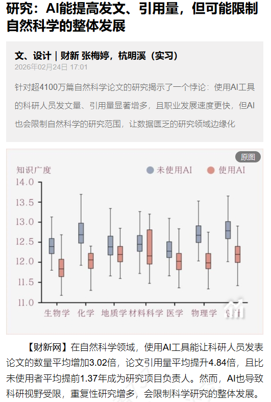 财新:《AI能提高发文、引用量,但可能限制自然科学的整体发展》文、设计|财新 张梅婷,杭明溪(实习)26年2月24日
