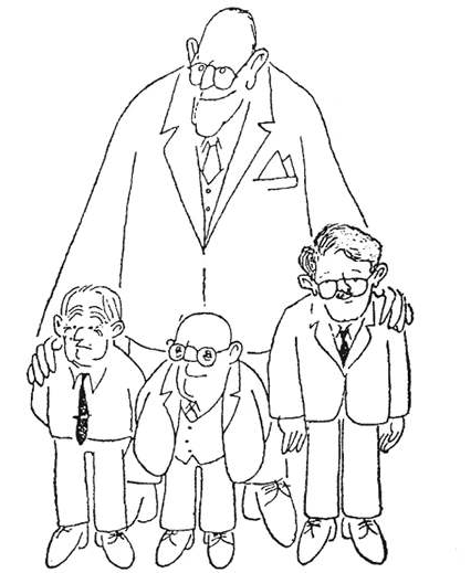 “序幕:同类中的另类”标题插图,尺寸被放大的人物,是法兰克福学派的主持者霍克海默,他担任“社会研究所”的所长,直到1965年。在这幅漫画里,霍克海默羽翼下,是法兰克福学派的三位核心思想家,左边是阿多诺,右边是哈贝马斯,中间是马尔库塞。序幕之所以名为“同类中的另类”,因为,哈贝马斯很少真正属于这样的法兰克福学派。