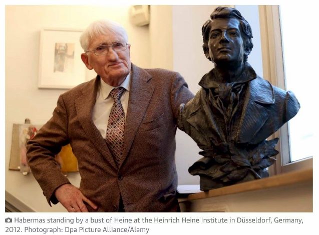 图2:Habermas standing by a bust of Heine at the Heinrich Heine Institute in Düsseldorf Germany 2012。